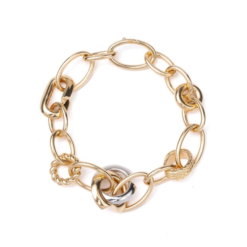 DescriptionCrafted in 18-karat Yellow and White Gold, the Menagerie Chain Bracelet includes five different styles of FoundRae chains as well as two Tenet links the Strong Heart link, ending and beginning with love, and a Snake link that forms a complete ci