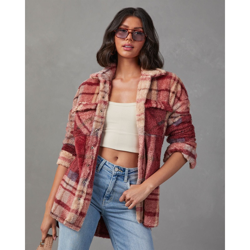 Its finally shacket SZN! Our Mendocino Plaid Soft Knit Jacket features wine, mocha, grey, and cream hues. Designed with bust pockets and front snap button closures. The coziest layer of warmth!Oversized fitStand collarLong sleeves with elastic cuffsBust po