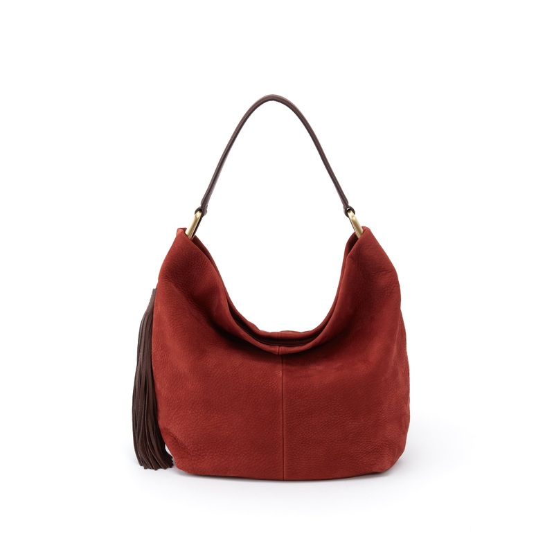 A Hobo icon, the Meridian shoulder purse is spacious & slouchy with an exterior phone pocket and fringe tassel for both utility and style. Crafted in our signature nubuck hide, the perfect suede leather buffed to a velvety touch.Brushed Antique Brass hardw