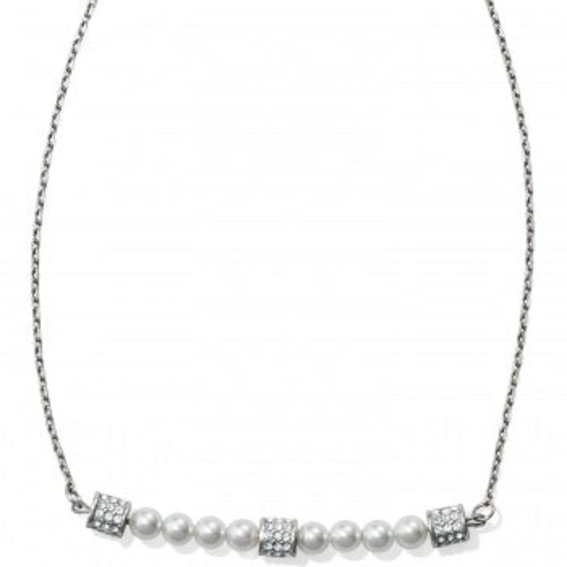 Marrying a contemporary bar motif with classic pearls, this petite necklace is both delicate and ladylike. Great for layering.Closure: Lobster ClawLength: 16" - 18" AdjustableMaterial: Swarovski crystal/PearlFinish: Silver plated