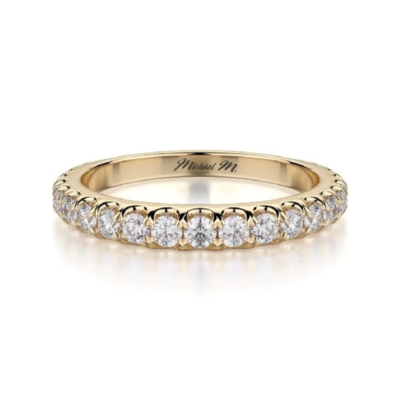 This stunning classic 18K yellow gold wedding band by Michael M. features round brilliant cut diamonds extending three-quarters of the way around totaling 0.60 carats.