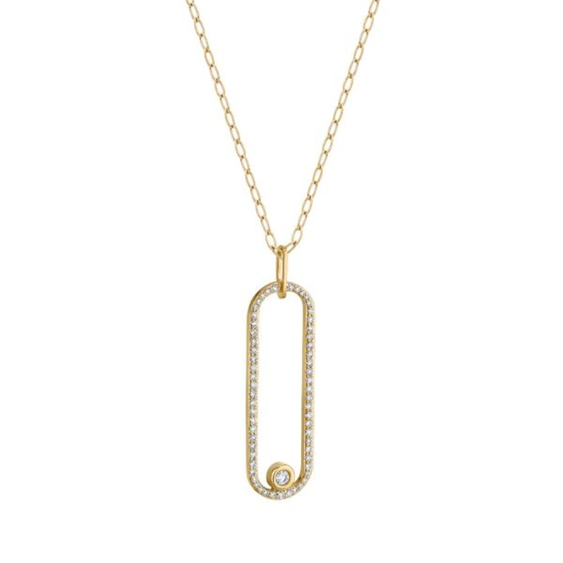 14K yellow gold oval drop pendant features white round cut diamonds around the edge and one bezel set round cut diamond in the bottom center 0.76cttw