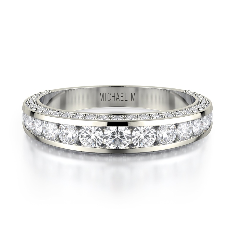 This Michael M 18K white gold wedding band is adorned with 0.80 carats total weight of brilliant round shaped prong set diamonds.