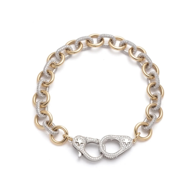 DescriptionCrafted in 18-karat white gold and yellow gold, this Midsized Mixed Link Diamond Pave Bracelet is a catalyst to tell your story. Beautiful on its own, the white gold diamond pave sister hooks are both the clasp and they way to tell your story by