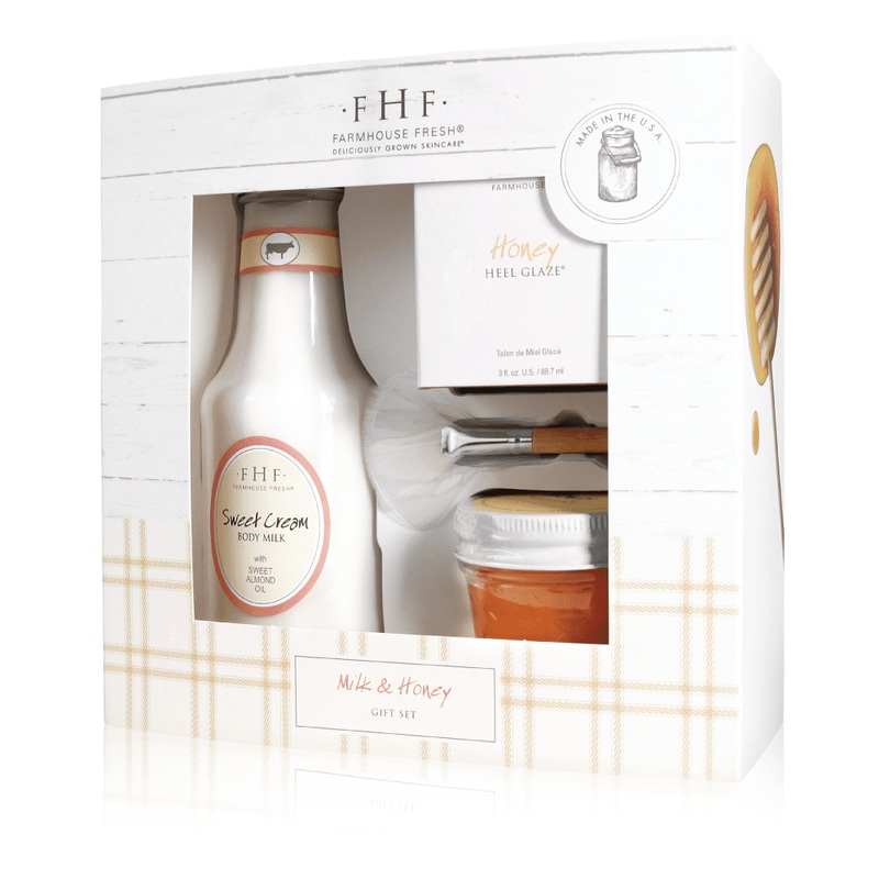 This set includes: 10 oz. Sweet Cream Body Milk Lotion and 3.25 oz. Honey Heel Glaze with a brush.