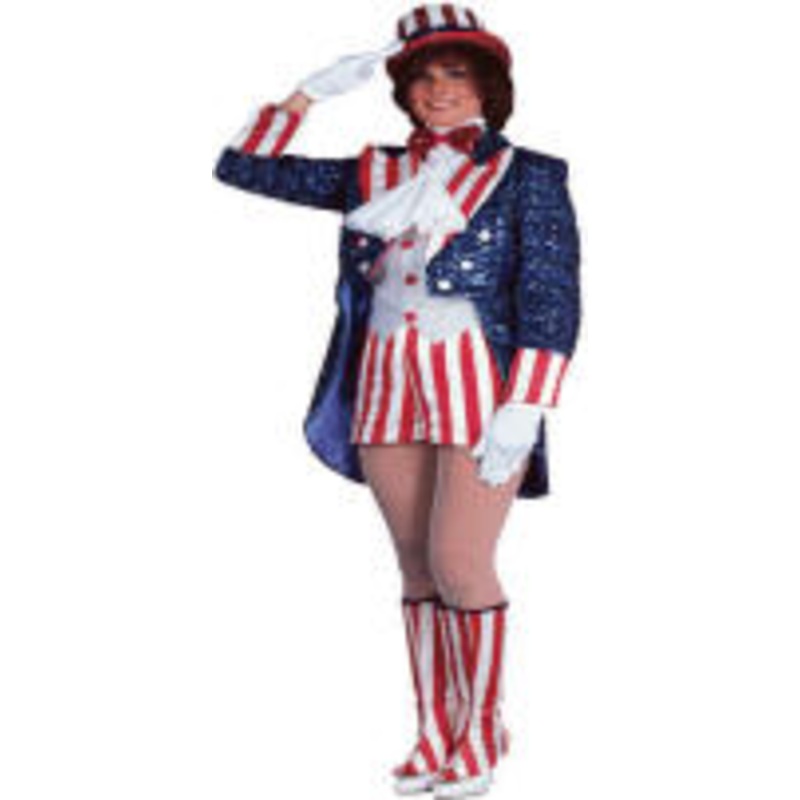 R90809Includes: Blue sequin jacket w/red & white satin lapels, cuffs & buttons. Silver lame vest front, red & white satin shorts & boot tops.Color: As ShownSize: S (6-10), M (10-14), L (14-16)