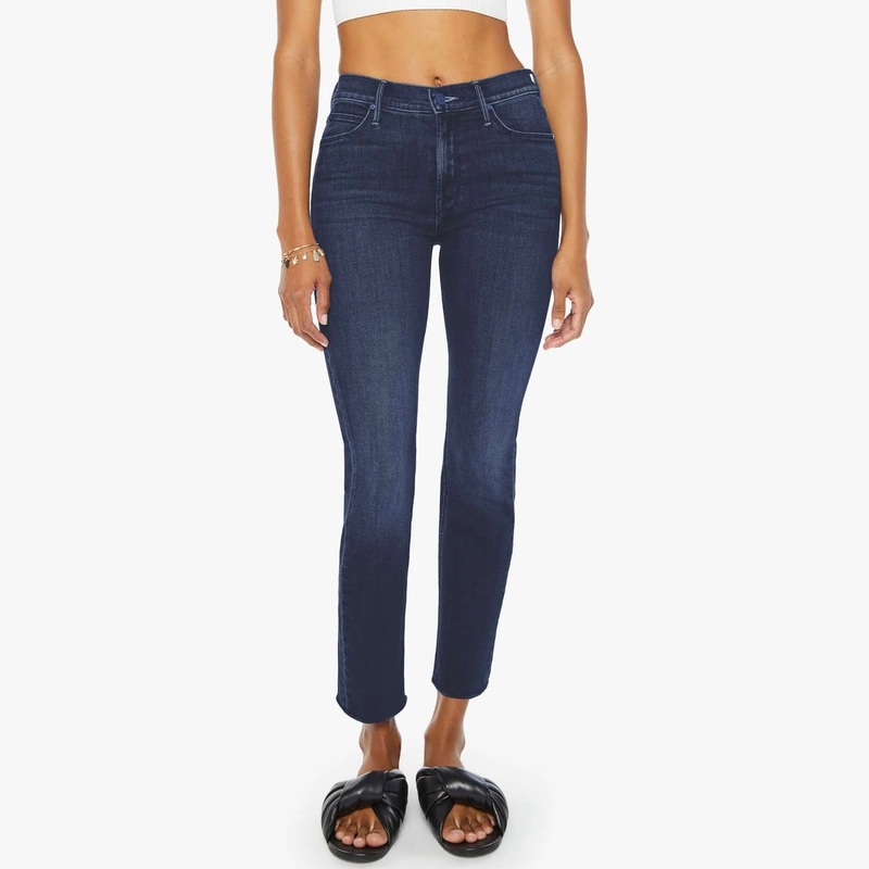 Mother Dazzler Mid Rise Jean in Chip On My Shoulder. Our most popular mid-rise straight leg hits at the ankle with a clean hem. Cut from denim with a touch of stretch, Chip On My Shoulder is a dark blue wash with super subtle fading and whiskering.