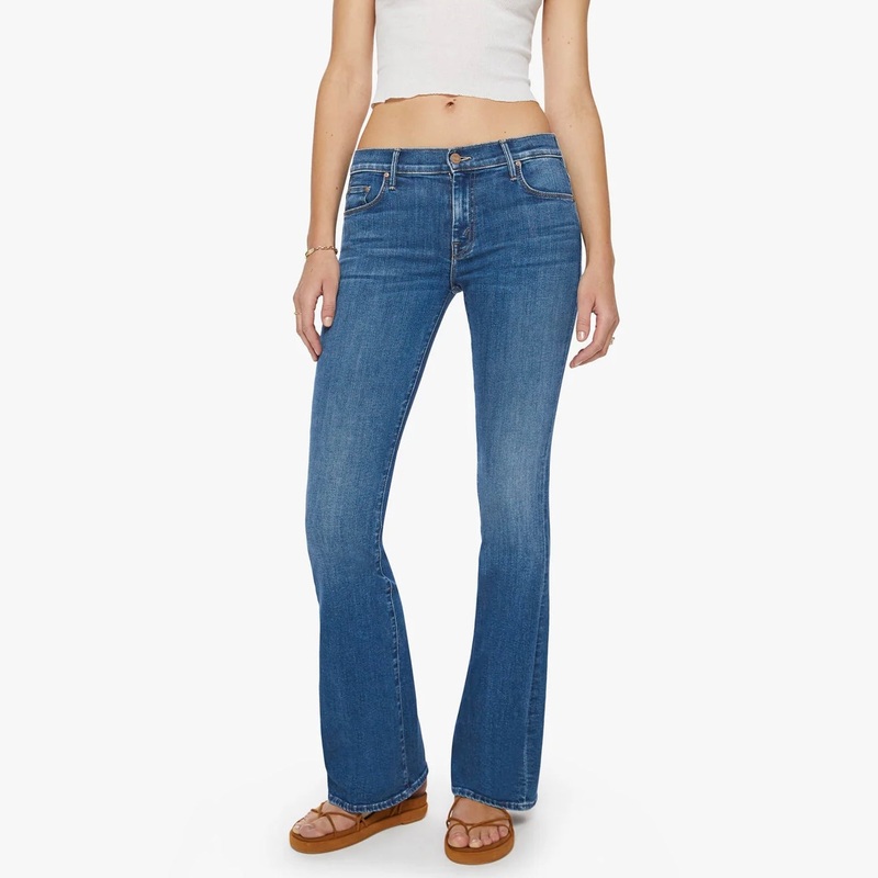 Mother Down Low Weekender in Right On!These super low-rise flares have a long 34-inch inseam and a clean hem. Cut from soft stretch denim, Right On! is a mid-blue wash with subtle fading and whiskering.
