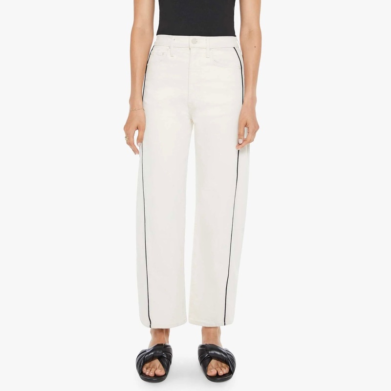 Mother Half Piped Ankle in Act Natural. Au naturel. A super high-waisted jean with a wide, curved leg, an ankle-length inseam and a clean hem. Cut from a SUPERIOR cotton blend with a touch of stretch, Act Natural is a creamy white with tonal hardware and a black pinstripe down the outer seam.