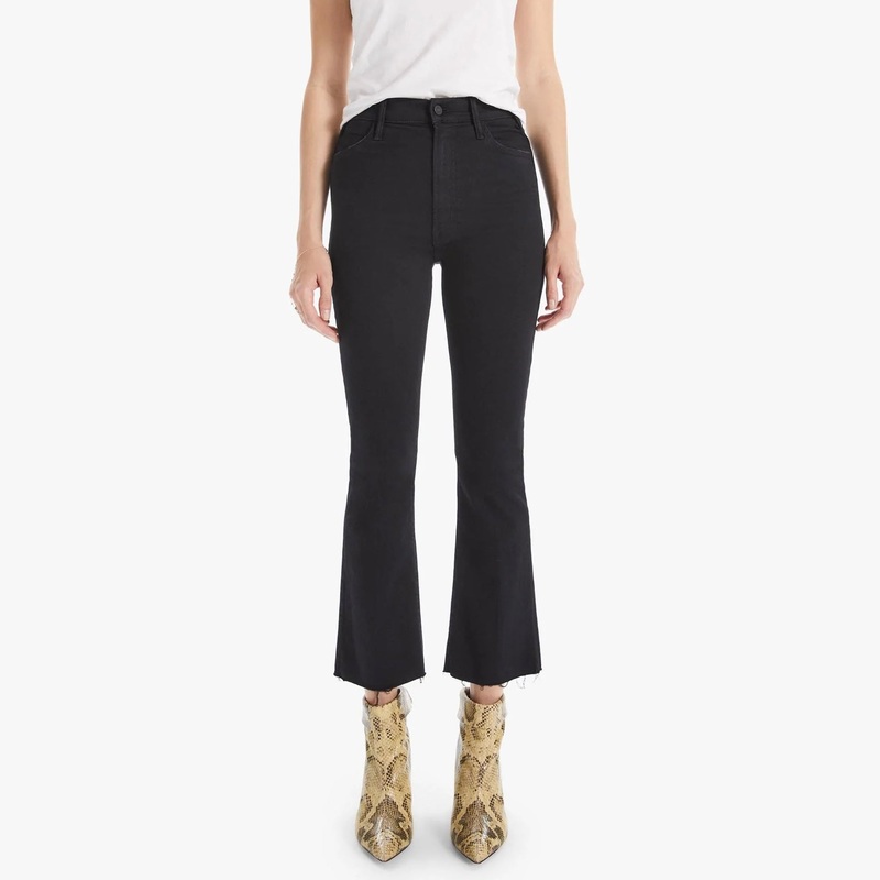 Mother Denim Hustler Jean in Black.These bestselling high-waist flare jeans have an ankle-length inseam and a raw hem. Made from stretch denim, Not Guilty is our bestselling black wash.Very Stretchy,High Rise,Bootcut,Ankle Length11" Rise27 1/2" Inseam16" L