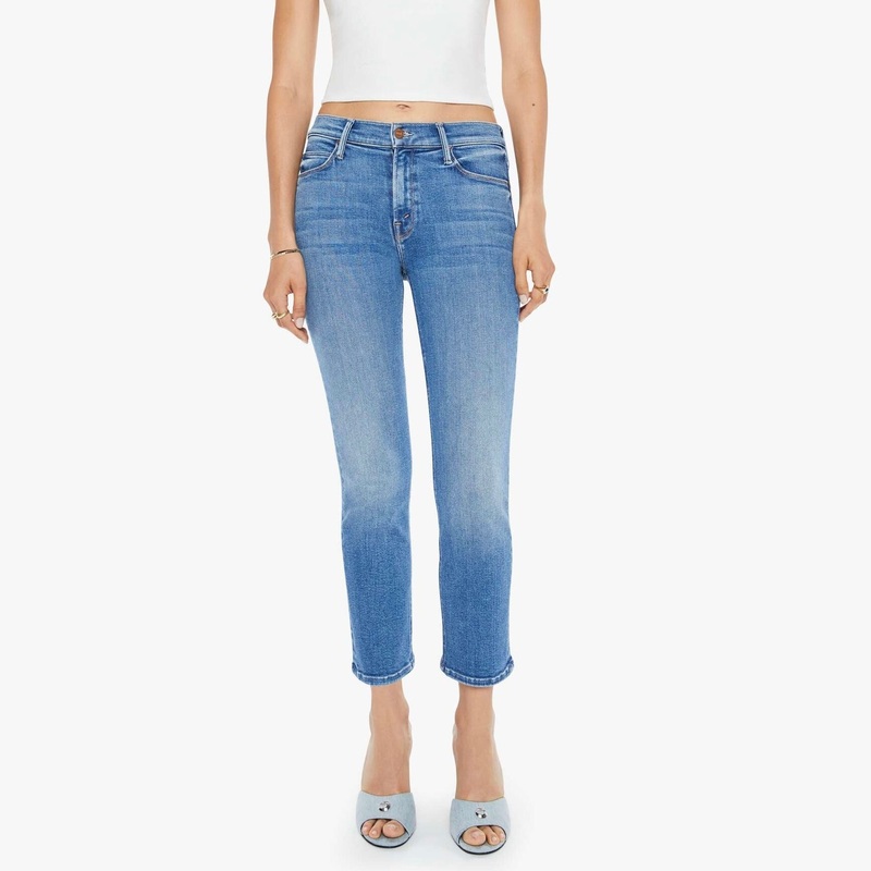 Mother Mid Rise Dazzler Crop Jeans in ready set go. On your mark. Mid-rise jeans with a straight leg, cropped inseam and clean hem. Made from stretch denim, Ready, Set, Go! is a mid-blue with subtle whiskering and fading at the knees.