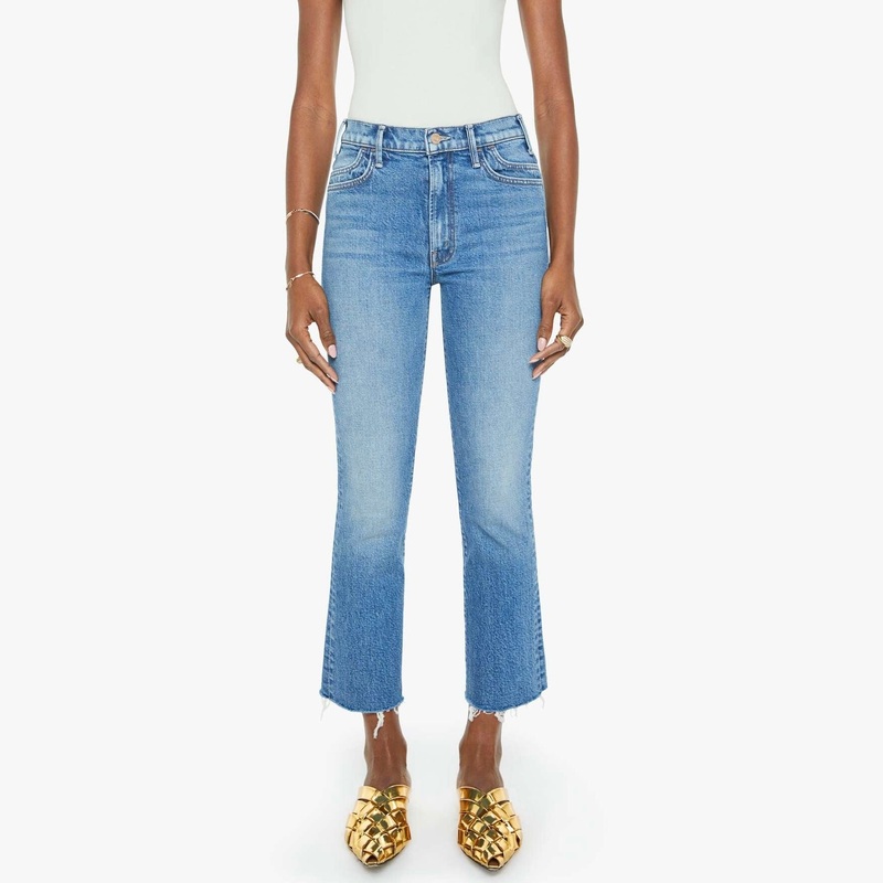 Mother Sunny Hustler in Tequila Sunrise. Happy hour. This bestselling high-rise flare has sunbeam back pockets, an ankle-length inseam and a clean hem. Made from denim with a touch of stretch, Tequila Sunrise is a mid-blue with whiskering and fading at the