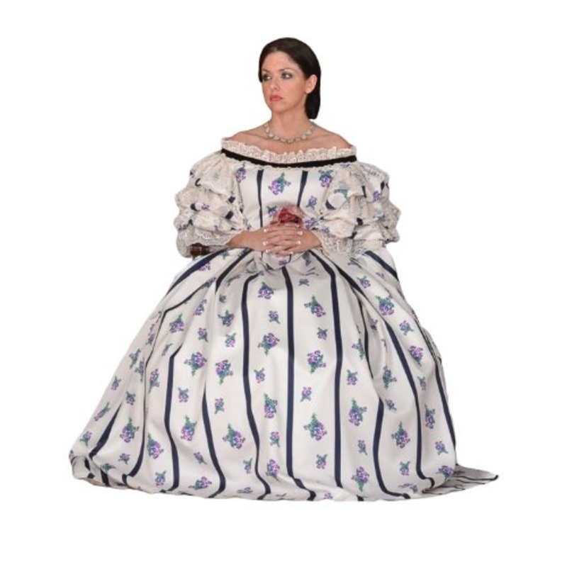 Includes: Beautiful white 2 piece dress with stripes and floral patterns.Color: White (shown)Size (Bust): S (34), M (36), L (39)Superior Quality / Made in USABuy with confidence knowing you will look incredible in this Mary Todd Lincoln Civil War Theatrica