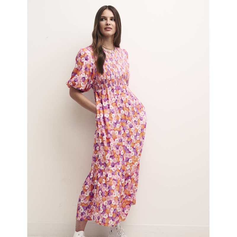 "Looking for a new smock dress youll wear over and over? Kelsie is the one.We love the chrysanthemum print blooming with orange, pink and purple flowers. Were also really into her extra puffy sleeves and floaty-tiered hem. Slip into high tops and wear her