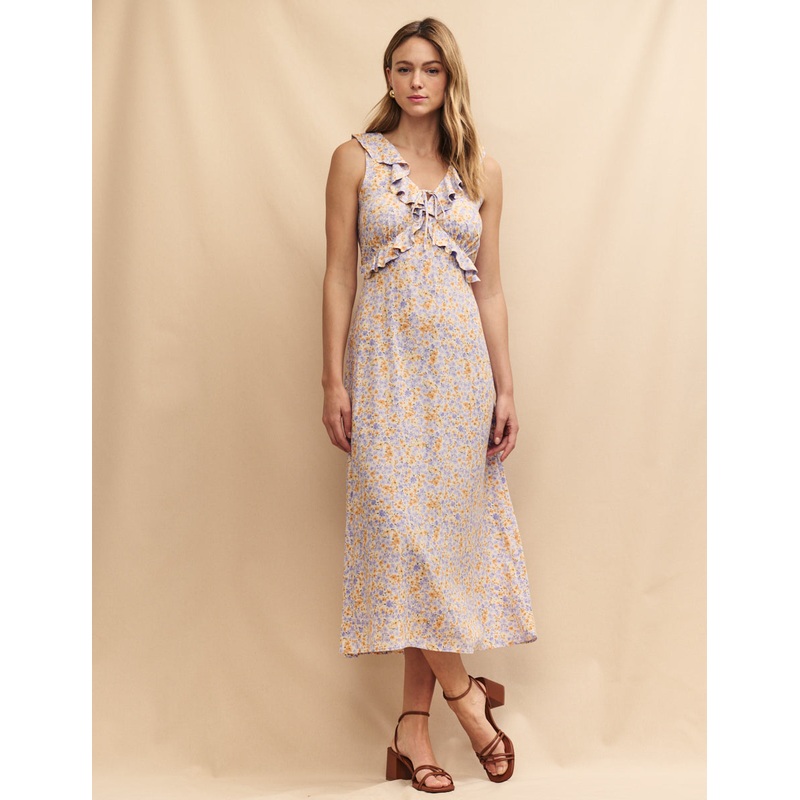 When it comes to creating a boho-inspired look, this Marjorie midi dress is top of our list. Framed by a sleeveless silhouette, with ruffled details and scattered with summer-ready blooms. Wear barefoot on the beach or take her to brunch with a pair of chu