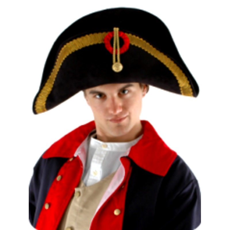This authentic bicorn is modeled after the hats worn by military and naval officialsin the late 18th century. Made of pressed EVA, covered in black ultra suede, complete with ornate gold detailing, a gold button and red satin ribbon medallion.Color: Black