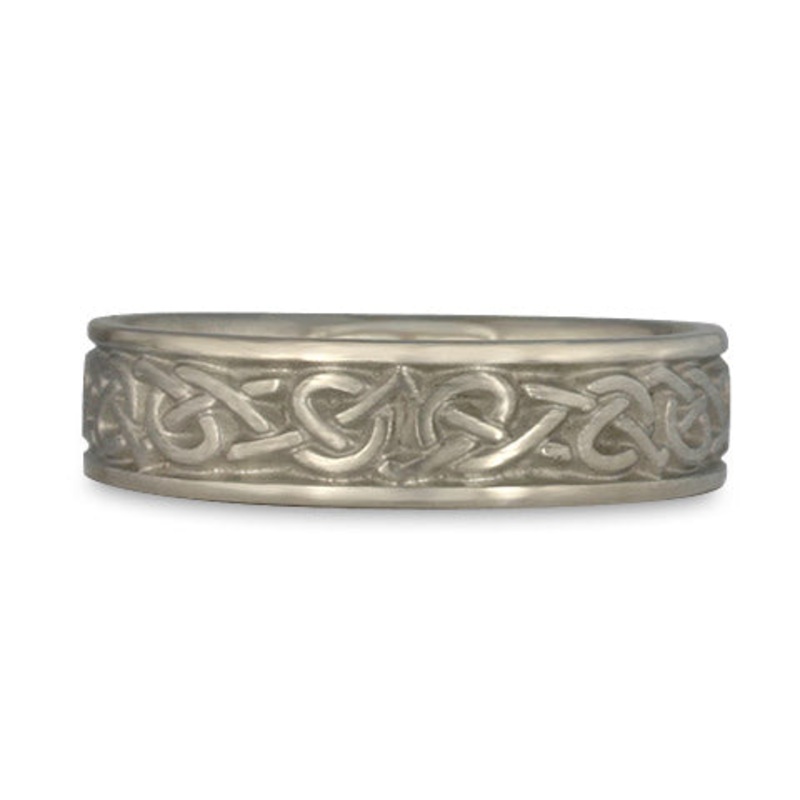This Narrow Celtic Hearts Wedding Ring in 14K White Gold by Katherine Aberle is made with eco-friendly methods using recycled 14K White Gold. It is sent to you via free Fedex ground shipping. This ring is available in sizes ranging from size 5 through size