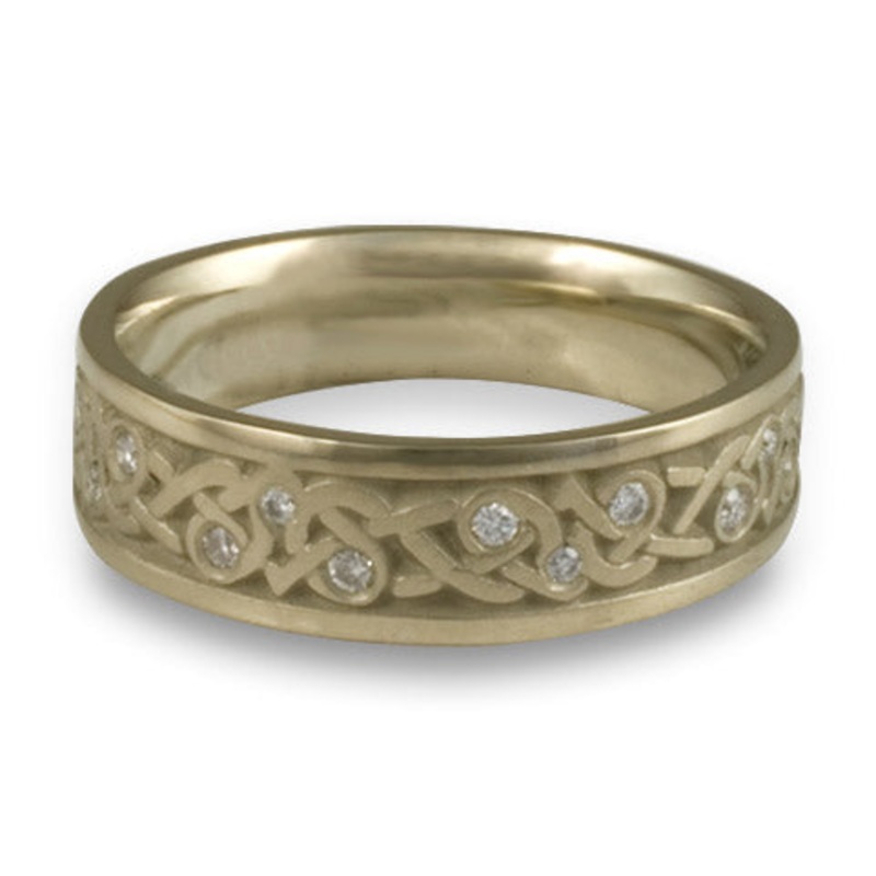 This Narrow Celtic Hearts with Diamonds Wedding Ring in 18K White Gold by Katherine Aberle is made with eco-friendly methods using recycled 18K White Gold. It is sent to you via free Fedex ground shipping. This ring is available in sizes ranging from size 5 through size 12. Other sizes may also be available. Please inquire by telephone for pricing on these.