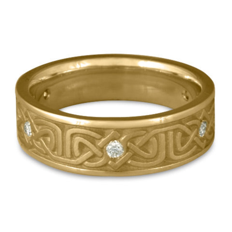 This Narrow Labyrinth Wedding Ring with Diamonds in 14K Yellow Gold by Katherine Aberle is made with eco-friendly methods using recycled 14K Yellow Gold. It is sent to you via free Fedex ground shipping. This ring is available in sizes ranging from size 5 through size 12. Other sizes may also be available. Please inquire by telephone for pricing on these.