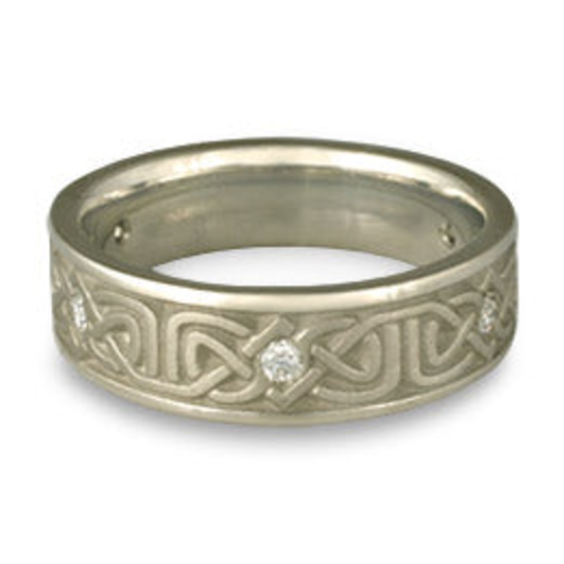 This Narrow Labyrinth Wedding Ring with Diamonds in Platinum by Katherine Aberle is made with eco-friendly methods using recycled Platinum. It is sent to you via free Fedex ground shipping. This ring is available in sizes ranging from size 5 through size 12. Other sizes may also be available. Please inquire by telephone for pricing on these.