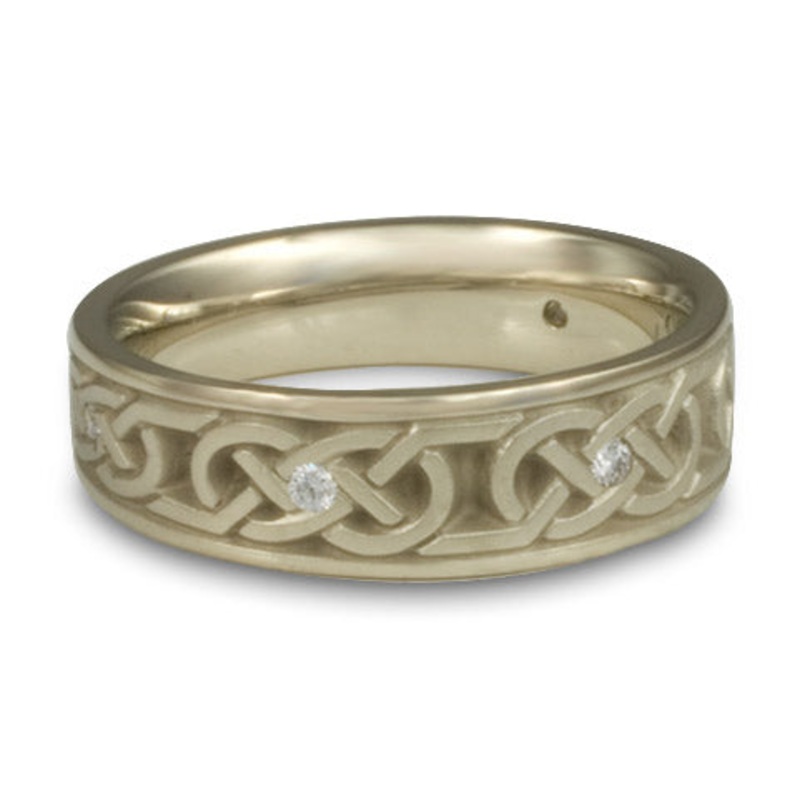 The Narrow Love Knot With Diamonds Wedding Ring carries an intrinsic meaning of depth in a relationship. This love knot symbolizes energy and complexity of two individual souls coming together, while maintaining a sense of harmony.Two threads run together