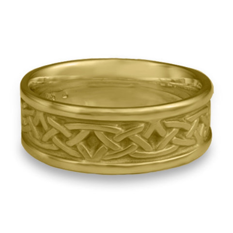 This Narrow Self Bordered Celtic Arches Wedding Ring in 18K Yellow Gold by Katherine Aberle is made with eco-friendly methods using recycled 18K Yellow Gold. It is sent to you via free Fedex ground shipping. This ring is available in sizes ranging from siz