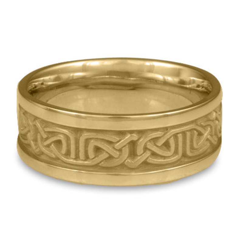 Symbolic Meaning: This is perhaps the most intricate of all the wedding ring knots, so it is appropriately called the Labyrinth. Those who are drawn to this ring have a love of complexity or mystery. If you look closely, there is hidden intention in the twists and turns of the individuals who join together in this pattern. Circles, which symbolize balance in relationship, become growth spirals. These are transformed into triangles, shooting upward and downward, into the heavens and into the earth. There is creative ebb and flow. In ancient times labyrinths were created, and people walked them in order to find direction in their live’s an attempt to locate the center of the labyrinth, which is metaphorical of one’s own inner and mysterious center.