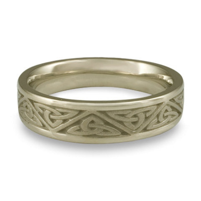 This Narrow Trinity Knot Wedding Ring in 18K White Gold by Katherine Aberle is made with eco-friendly methods using recycled 18K White Gold. It is sent to you via free Fedex ground shipping. This ring is available in sizes ranging from size 5 through size 12. Other sizes may also be available. Please inquire by telephone for pricing on these.