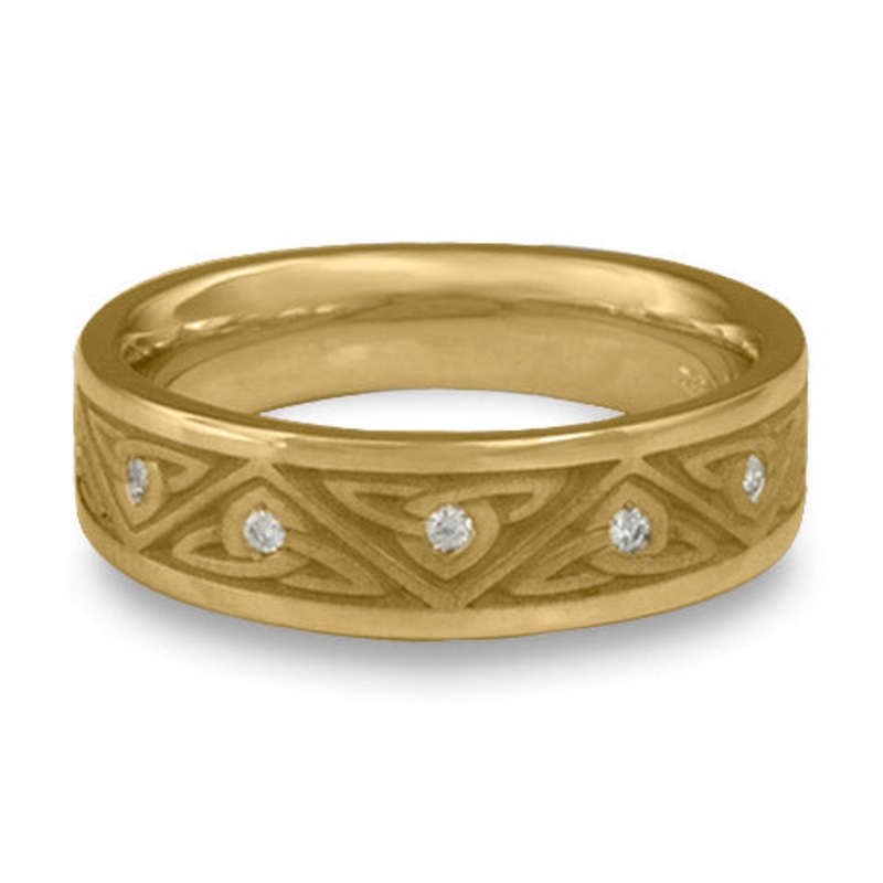 This Narrow Trinity Knot With Diamonds Wedding Ring in 14K Yellow Gold by Katherine Aberle is made with eco-friendly methods using recycled 14K Yellow Gold. It is sent to you via free Fedex ground shipping. This ring is available in sizes ranging from size 5 through size 12. Other sizes may also be available. Please inquire by telephone for pricing on these.