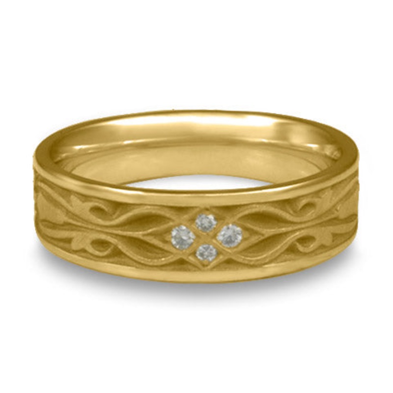 Symbolic Meaning: The central motif in this ring is a diamond shape accented with four small diamonds. The diamond design, with its pointed top and sides, represents connection to both Spirit and the Earth. With this ring, the horizontal points of the diamond extend to create the image of a flower. In sum, this ring symbolizes walking on Earth while connecting to both Beauty and Spirit.