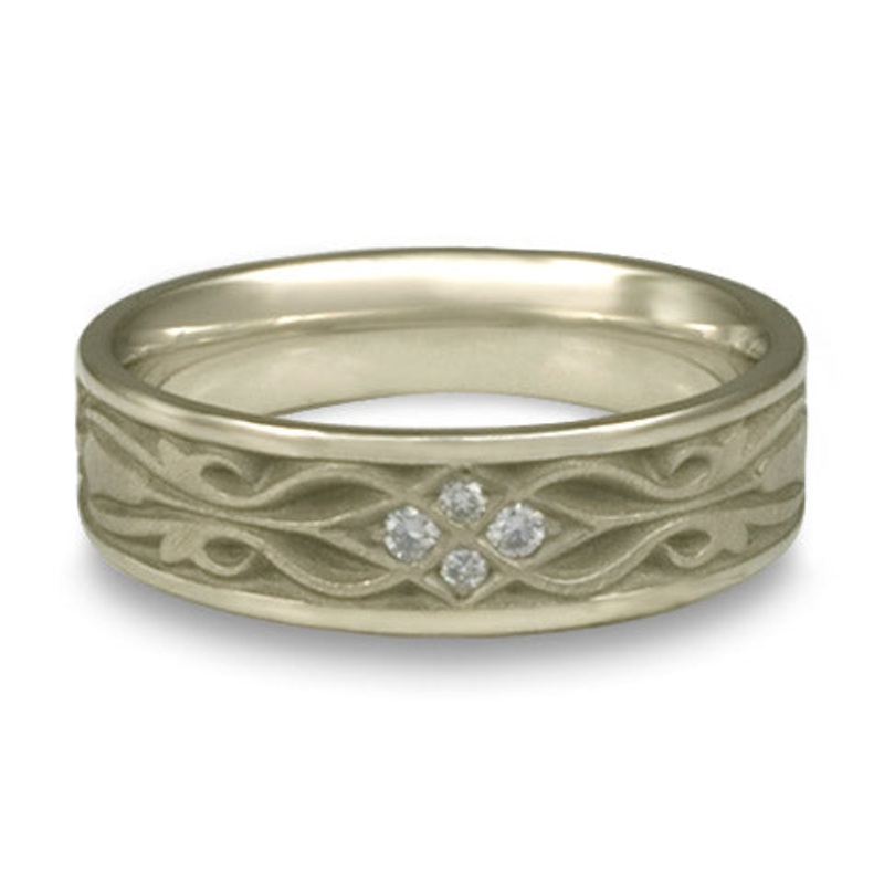 Symbolic Meaning: The central motif in this ring is a diamond shape accented with four small diamonds. The diamond design, with its pointed top and sides, represents connection to both Spirit and the Earth. With this ring, the horizontal points of the diamond extend to create the image of a flower. In sum, this ring symbolizes walking on Earth while connecting to both Beauty and Spirit.