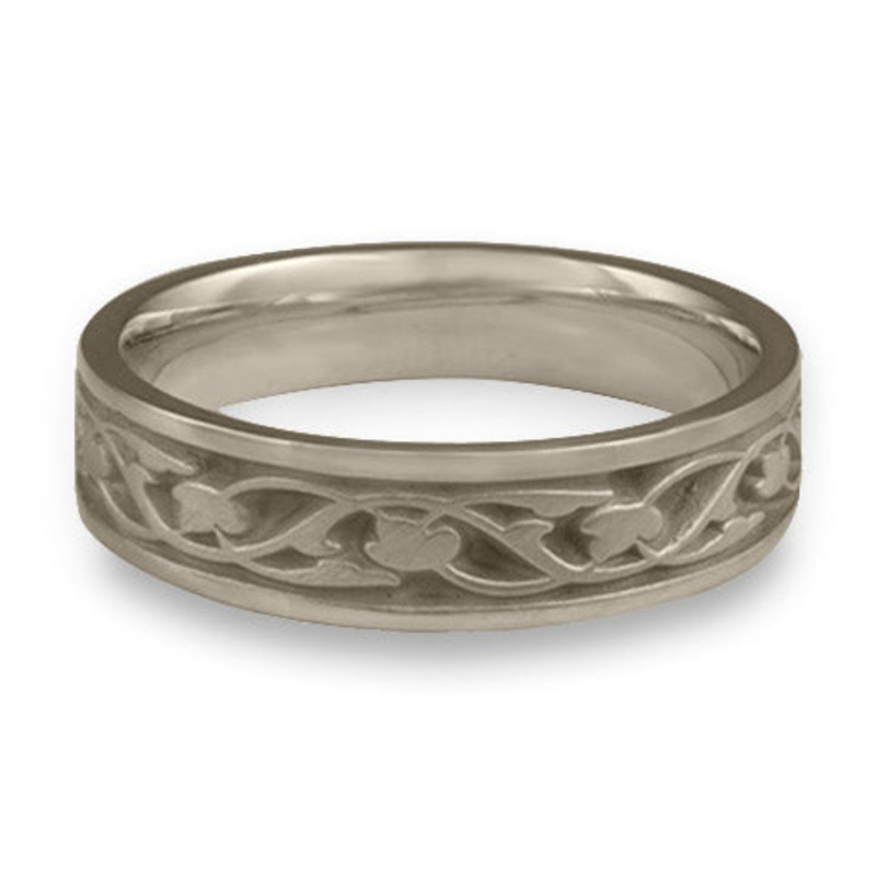This Narrow Tulips and Vines Wedding Ring in 14K White Gold by Katherine Aberle is made with eco-friendly methods using recycled 14K White Gold. It is sent to you via free Fedex ground shipping. This ring is available in sizes ranging from size 5 through size 12. Other sizes may also be available. Please inquire by telephone for pricing on these.