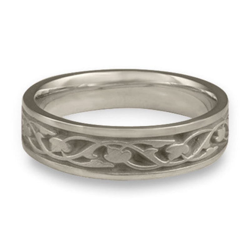 This Narrow Tulips and Vines Wedding Ring in Platinum by Katherine Aberle is made with eco-friendly methods using recycled Platinum. It is sent to you via free Fedex ground shipping. This ring is available in sizes ranging from size 5 through size 12. Othe