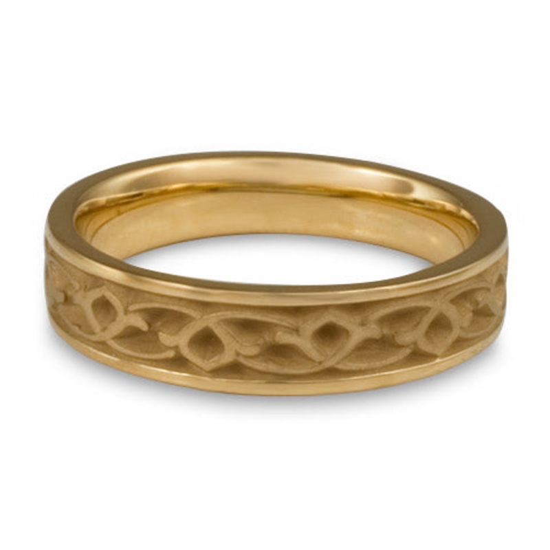 This Narrow Water Lilies Wedding Ring in 14K Yellow Gold by Katherine Aberle is made with eco-friendly methods using recycled 14K Yellow Gold. It is sent to you via free Fedex ground shipping. This ring is available in sizes ranging from size 5 through size 12. Other sizes may also be available. Please inquire by telephone for pricing on these.