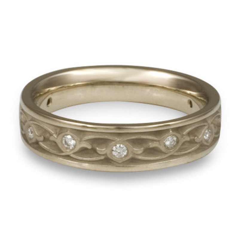 This Narrow Water Lilies Wedding Ring With Diamonds in 14K White Gold by Katherine Aberle is made with eco-friendly methods using recycled 14K White Gold. It is sent to you via free Fedex ground shipping. This ring is available in sizes ranging from size 5