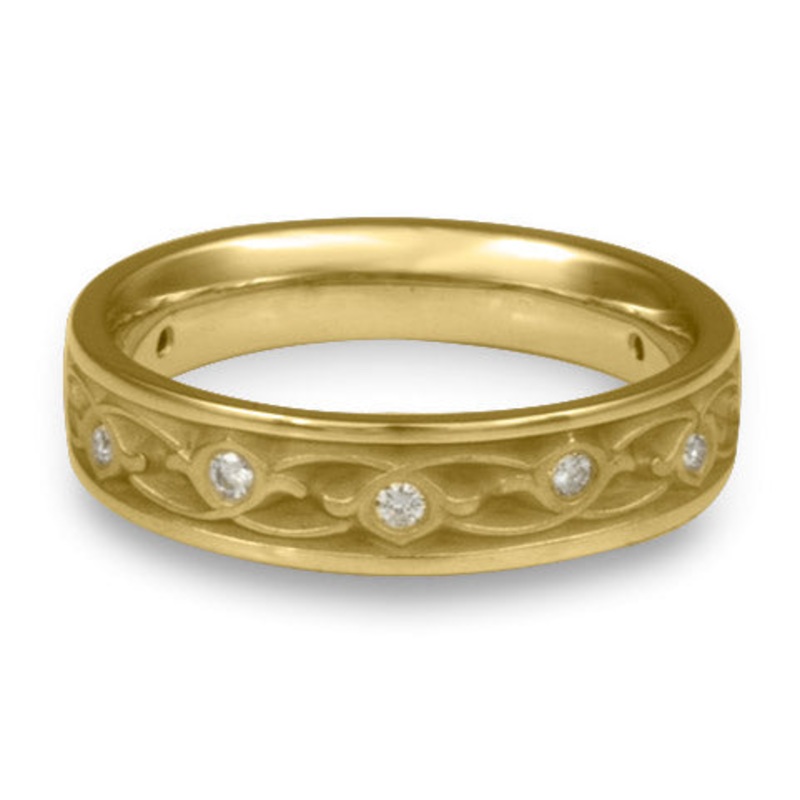 This Narrow Water Lilies Wedding Ring With Diamonds in 18K Yellow Gold by Katherine Aberle is made with eco-friendly methods using recycled 18K Yellow Gold. It is sent to you via free Fedex ground shipping. This ring is available in sizes ranging from size