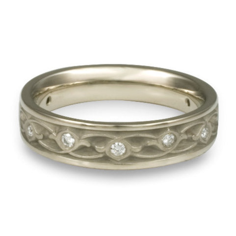 This Narrow Water Lilies Wedding Ring With Diamonds in Platinum by Katherine Aberle is made with eco-friendly methods using recycled Platinum. It is sent to you via free Fedex ground shipping. This ring is available in sizes ranging from size 5 through siz