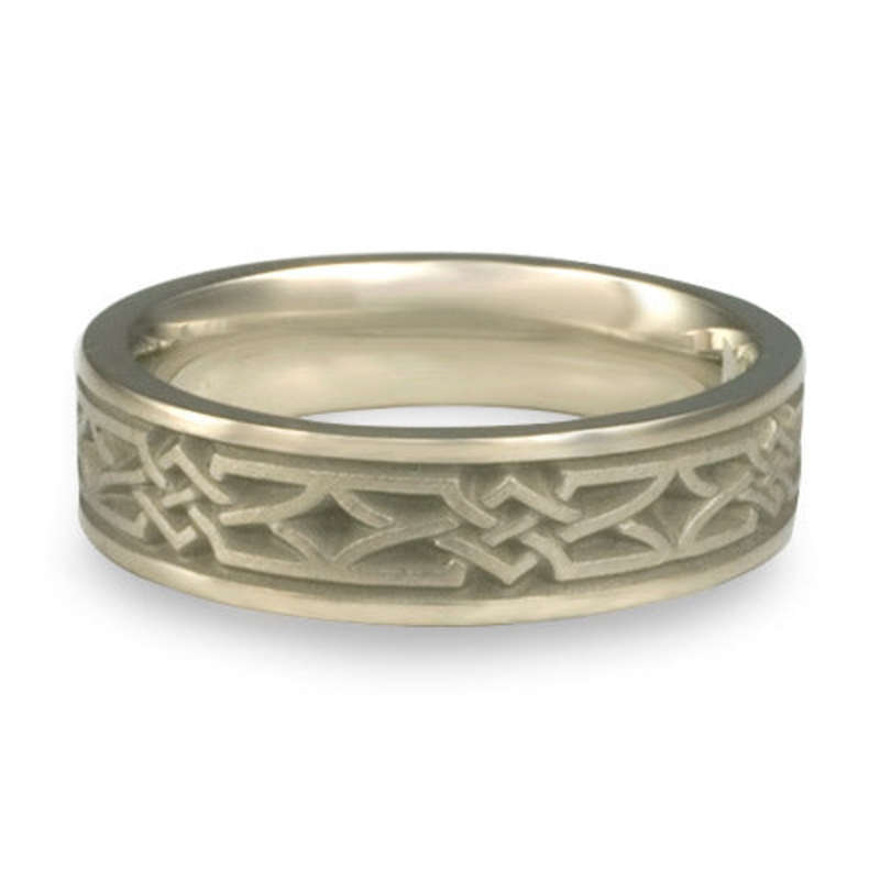 Symbolic Meaning: With the knot work in the Weaving Stars ring, the emphasis, with the rectangular design, is on strong personal communication within the borders of commitment, a represented by the circular ring itself. The two individuals also have very strong intentions and direction, but Spirit is present as well. This is illustrated by the diamond motifs within the rectangle and outside it, symbolizing opening up to inspiration individually and within the context of the relationship as a whole.