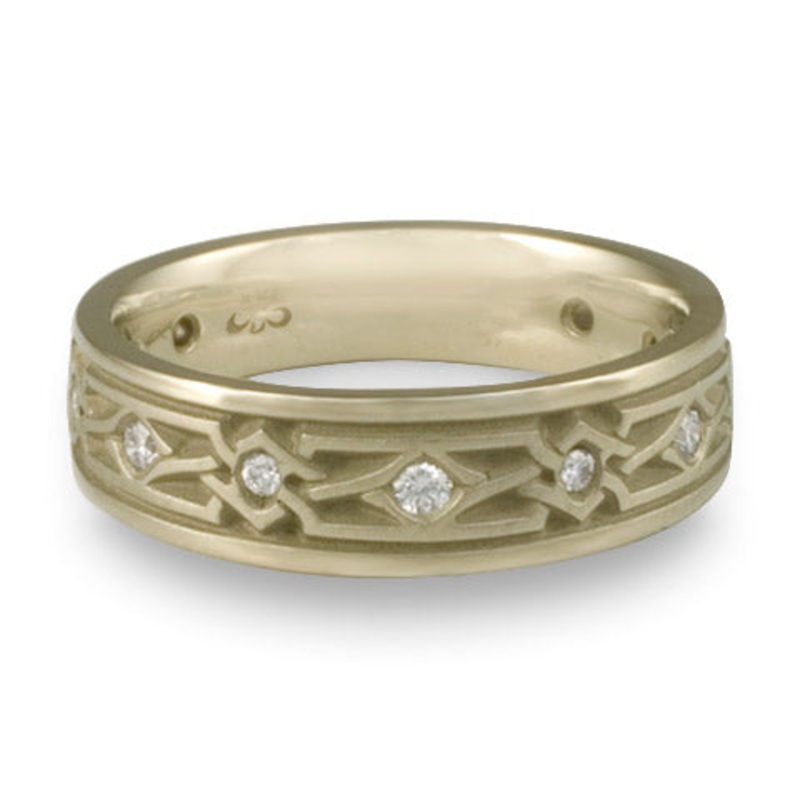 This Narrow Weaving Stars With Diamonds Wedding Ring in 18K White Gold by Katherine Aberle is made with eco-friendly methods using recycled 18K White Gold. It is sent to you via free Fedex ground shipping. This ring is available in sizes ranging from size 5 through size 12. Other sizes may also be available. Please inquire by telephone for pricing on these.