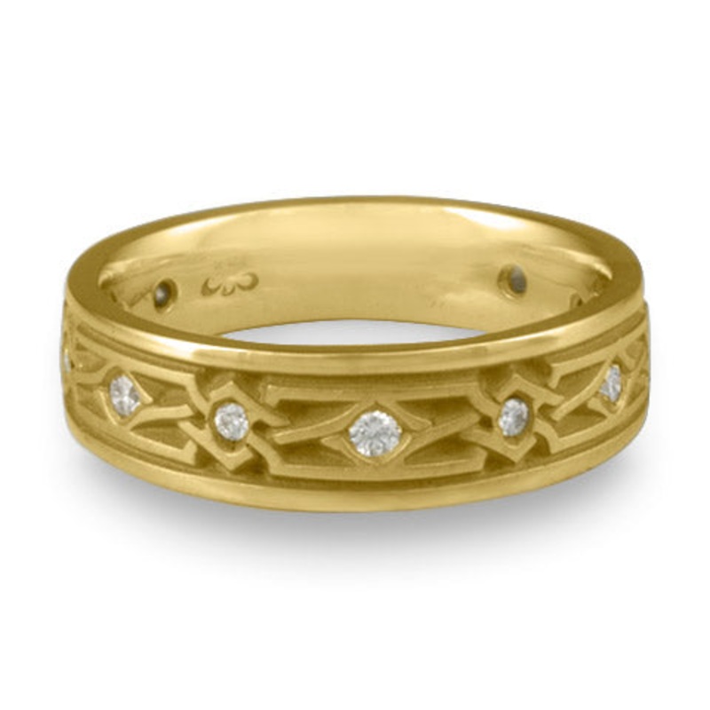 This Narrow Weaving Stars With Diamonds Wedding Ring in 18K Yellow Gold by Katherine Aberle is made with eco-friendly methods using recycled 18K Yellow Gold. It is sent to you via free Fedex ground shipping. This ring is available in sizes ranging from size 5 through size 12. Other sizes may also be available. Please inquire by telephone for pricing on these.