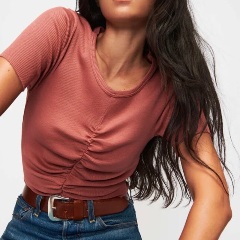 Nation Nevina Gathered Tee in Cardamom.Model is wearing size small.2302RB95% Cotton, 5% Spandex