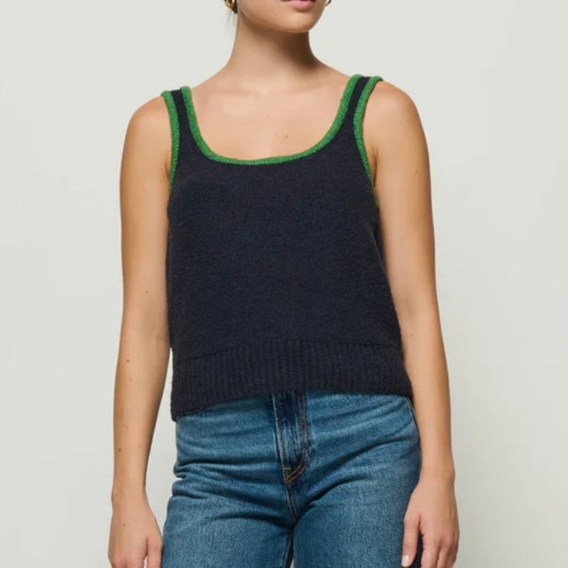 Nation Peggy Sue Tank in night sky. A little sporty, a lot chic. This textured knit tank features a contrast color band around the armholes and squared neckline with a ribbed hem and reverse jersey stitching throughout. This one comes in Night Sky.