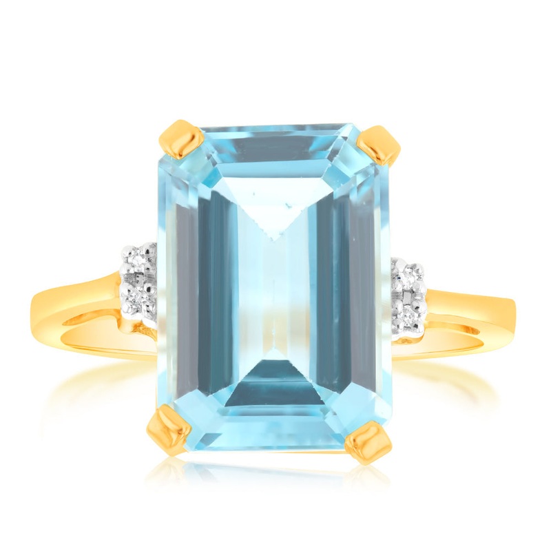 Natural Emerald Cut 14x10mm Blue Topaz & Small Diamonds in 9ct Yellow Gold