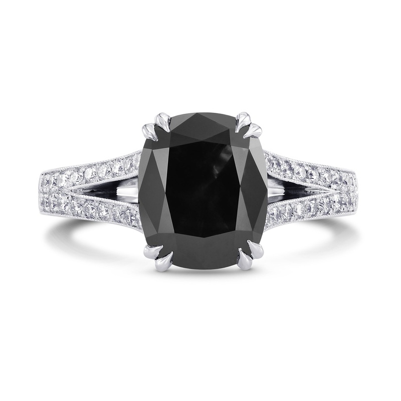 A magnificent all natural unheated Fancy Black cushion shape diamond ring with a pave split shank, mounted in 18K white gold. The center diamond is certified by GIAas Natural Fancy Black 3.05Ct Cushion Modified Brilliant and secured with four double tiger claw prongs. The split shank is pave-set with collection colorless round brilliants, with closed pave setting and a milgrain edge.