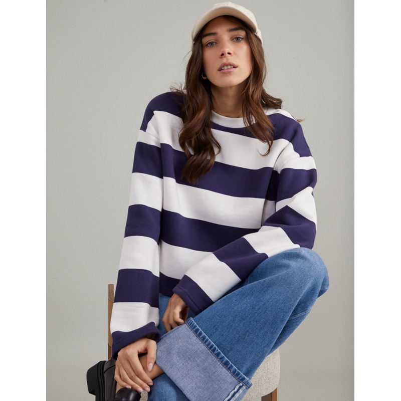 Stripe up your life. Coming in classic purple and white stripes, our so-now top will be your new go-to. We especially love the oversized fit and white hems that complete this look. Were wearing ours with NC jeans. Crew neck Long sleeves Designed for a rela