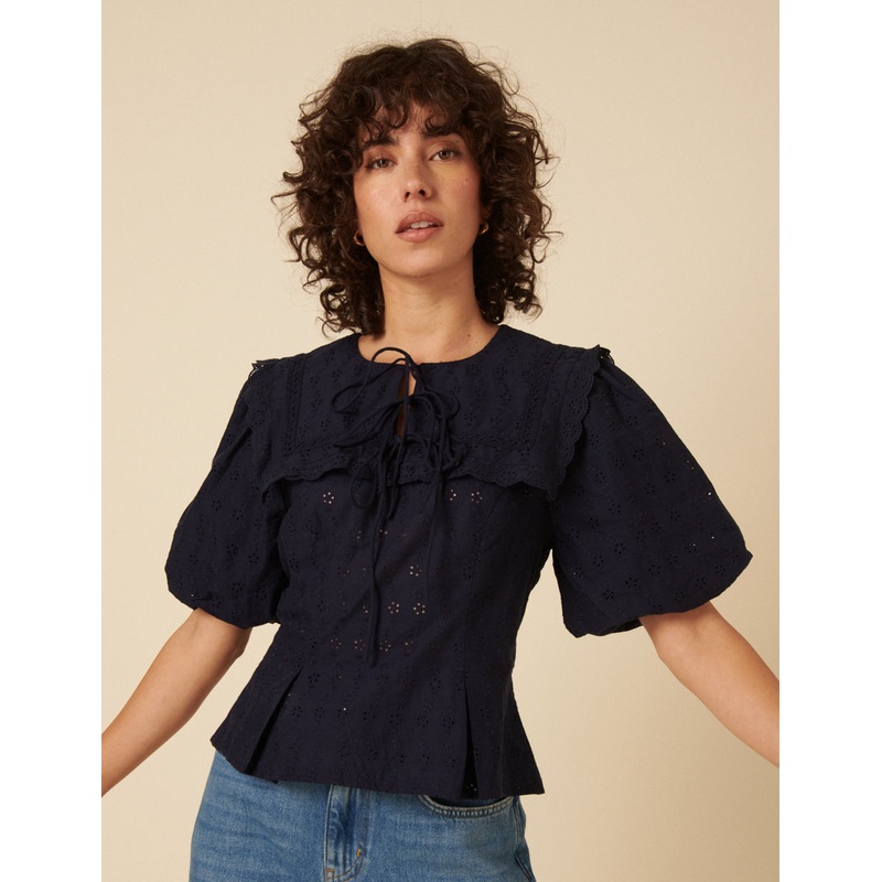 Meet Bella, your new favourite blouse. Coming in navy, we love the broderie detail and pretty trio of ties at the oversize collar. She has an adjustable tie at the back so you can get that perfect fit. Style with your favourite NC jeans. Oversize sailor co