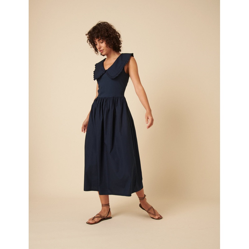 Introducing Eden. Coming in navy with a sleeveless design, we love her statement ruffle collar that adds a touch of romance. She flows to an A-line swishy skirt. Simply style with sandals.