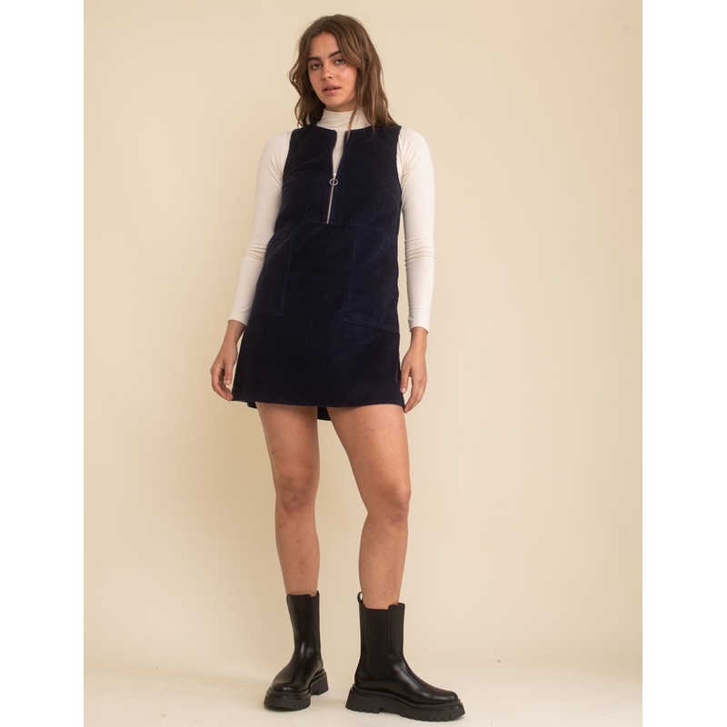 A dream day dress. Expertly crafted from cord made from organic cotton, this navy pinny is the perfect autumn layering piece. The shift shape is so easy to wear plus theres statement pockets. Style yours with everything you already own.
