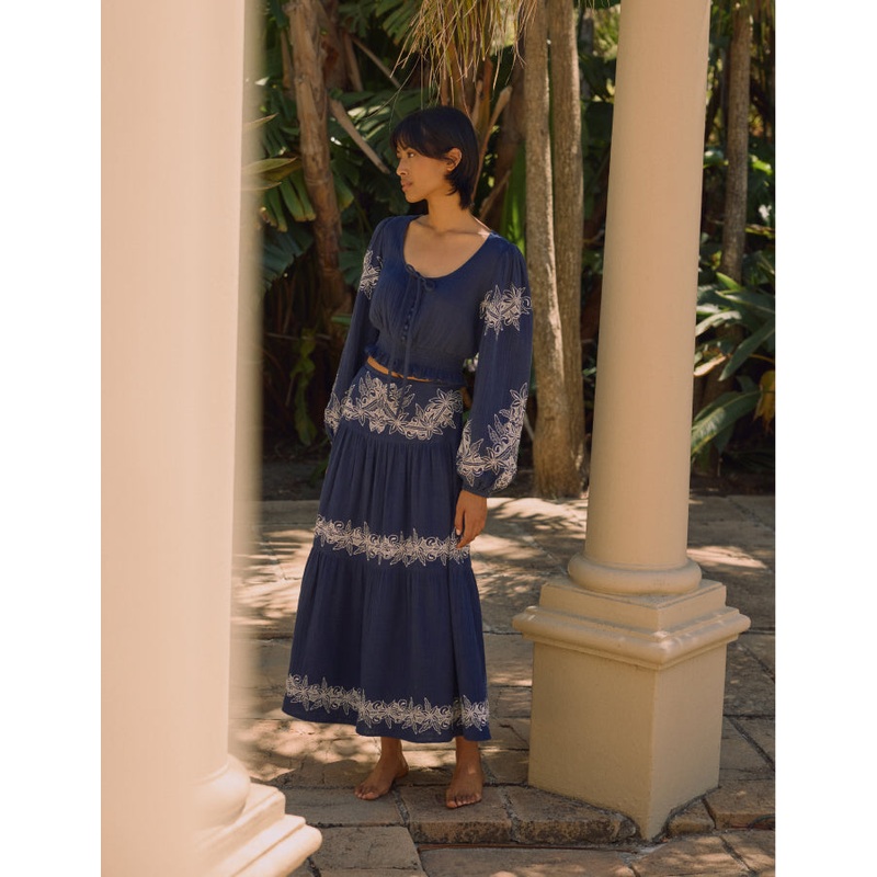The wear-on-repeat skirt. In a lightly textured navy with a contrast white print, this tiered midi skirt is designed with a shirred waist for an easy, flattering fit. Pair it with the matching blouse for a cool, coordinated look. Panelled waist designed to flatter