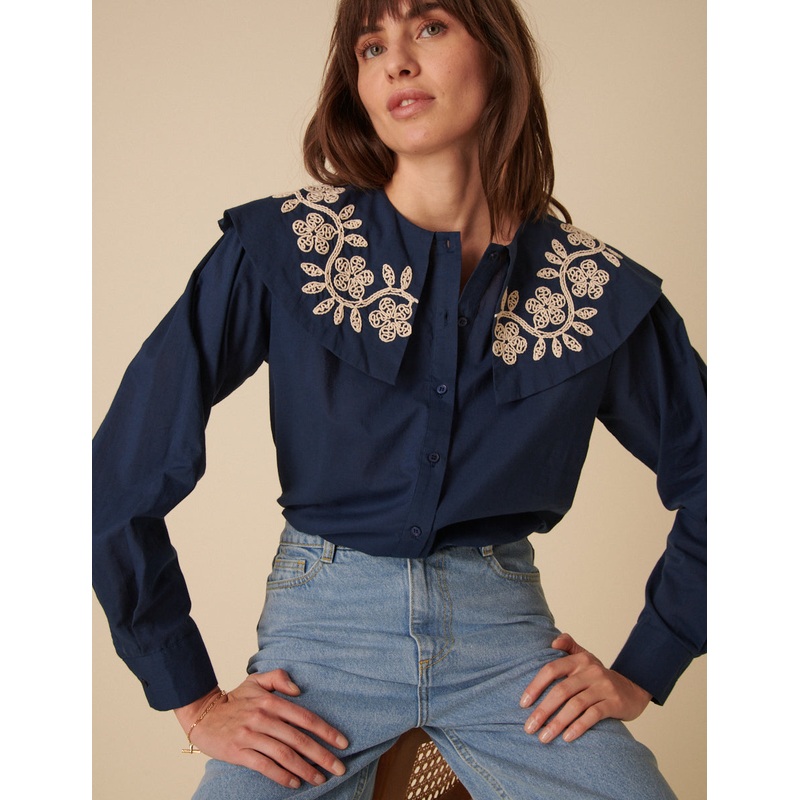 Its all about the details. Add some flair to your wardrobe with our navy shirt. Designed with intricate floral embroidery along the oversized collar, its a standout piece. Wear it with your favourite NC jeans, tucked or untucked.Long sleeves Designed for a